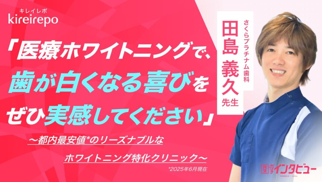 昼間・夜間 / 審美・一般歯科、それぞれ2つの側面で患者様の歯とお口の健康美をサポートする「さくらプラチナム歯科」院長の田島です。昼は都内最安値の医療ホワイトニングなどをご提供、夜は救急、急患の方をメインに診療しています。