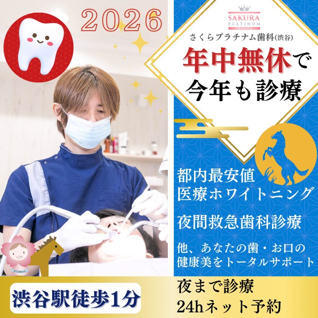 2026年現在、さくらプラチナム歯科(渋谷)は、年中無休・夜間救急診療を継続しています。