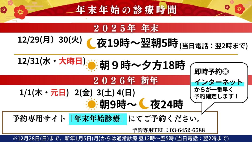 なお、2025年12/28(日)まで、及び1月5日(月)からの診療時間は、「昼12時〜翌5時:当日受付翌2時まで」です。