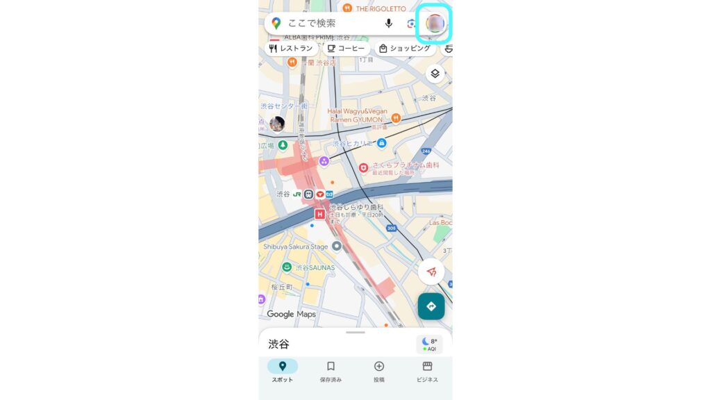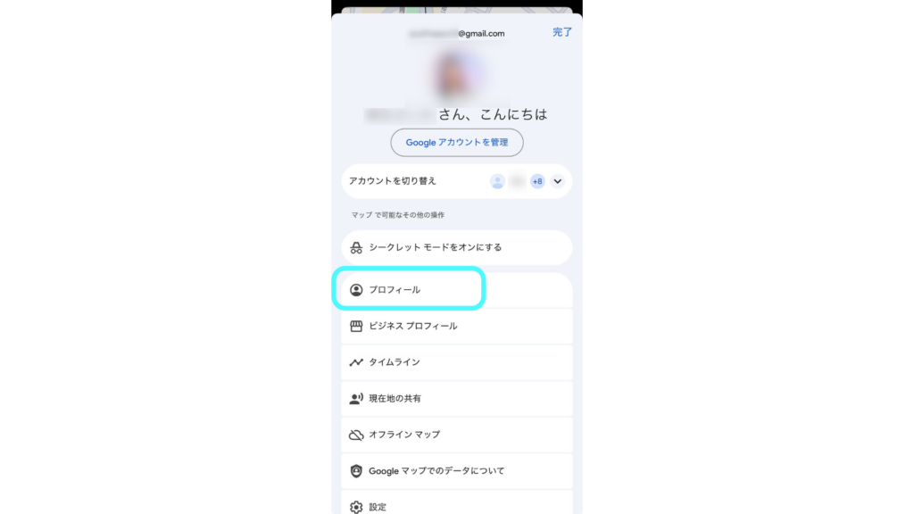 Googleマップを開き、右上、プロフィールアイコンをタップ