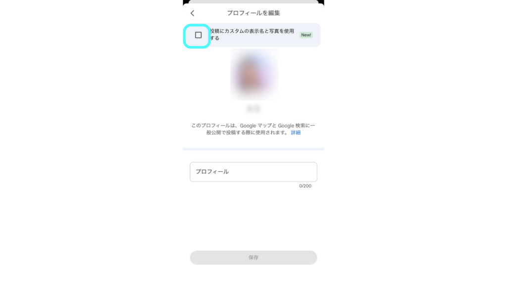 「投稿にカスタム表示名と写真を使用する」の左のチェックボックスをタップ
