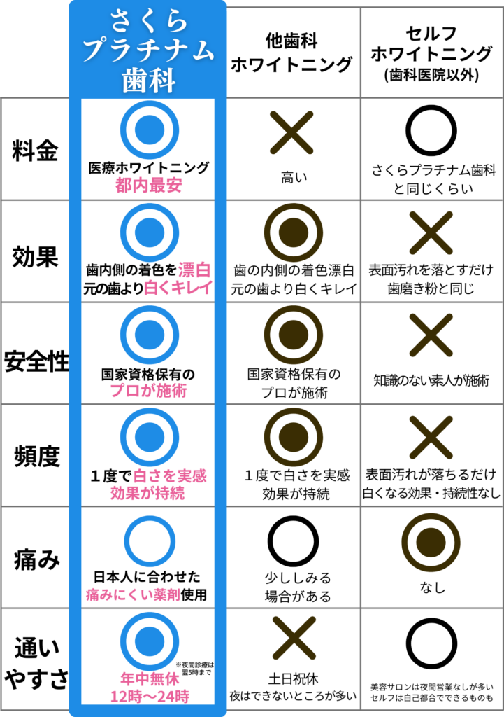 安全で効果的な医療ホワイトニングを、都内最安値のさくらプラチナム歯科で受けて、キレイな白い歯を手に入れてくださいね。