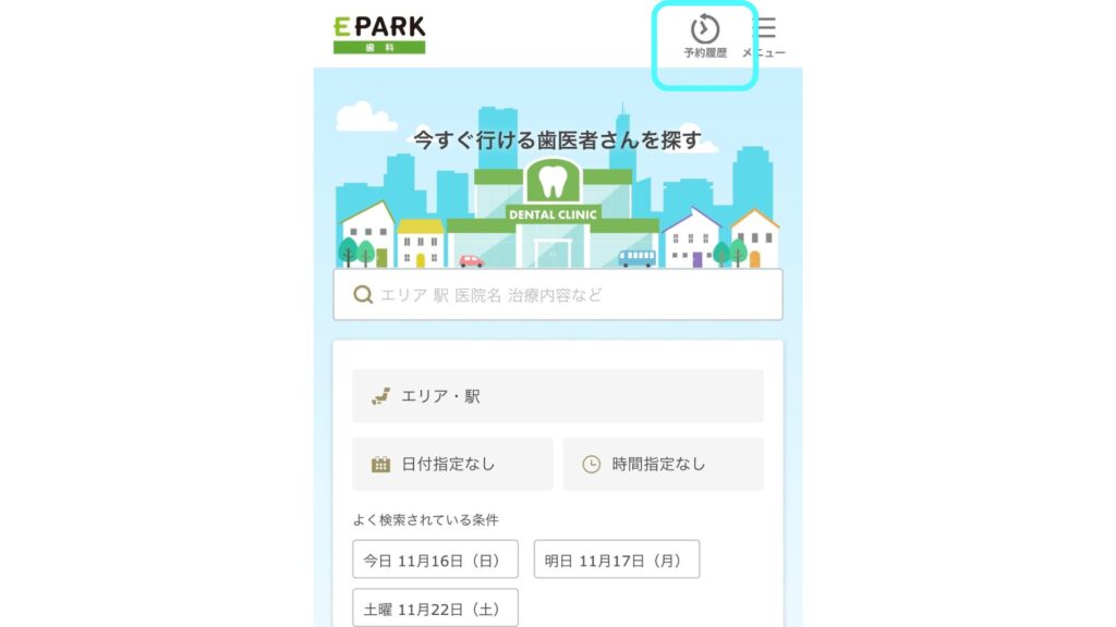※「EPARK(飲食店の予約など)」とは別のサイトです(× https://epark.jp/)。 EPARK”歯科”とEPARKのロゴの下に緑の「歯科」があるのを確認してください。
