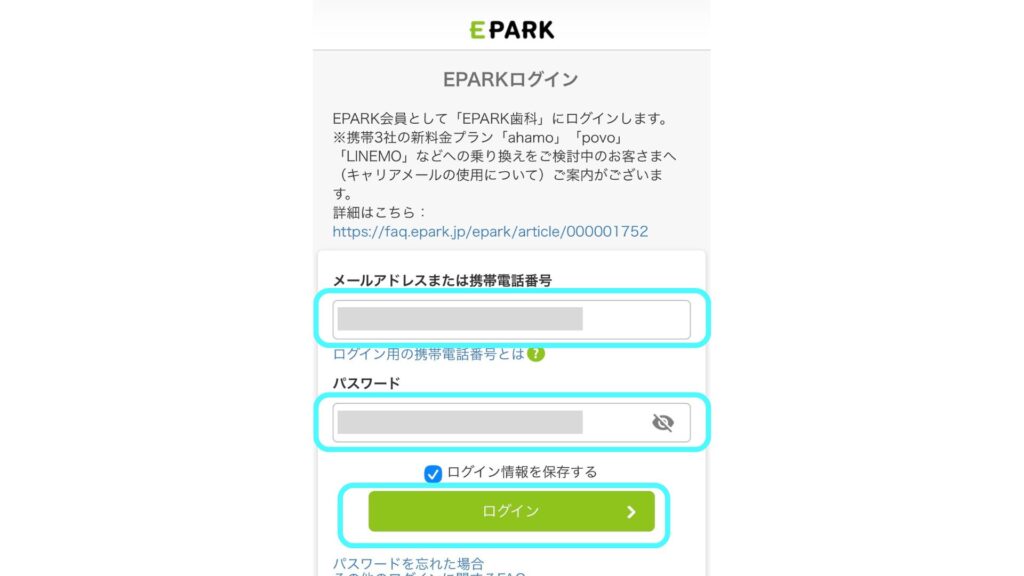 ※インターネット初回予約時に、EPARK会員に登録が行われています。パスワードがわからない方などは、下の「パスワードを忘れた場合」からご確認ください。
